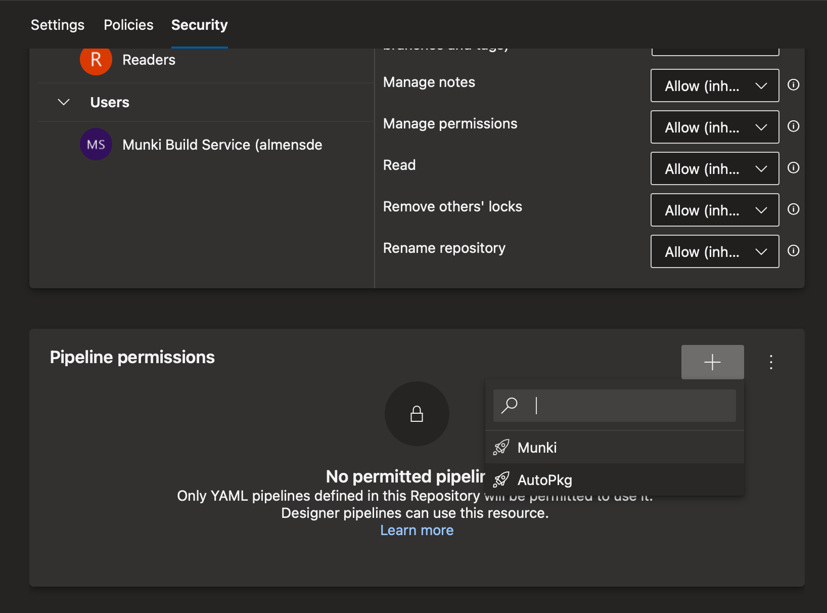 Now we have to give our AutoPkg pipeline permissions to the Azure DevOps Munki repo.