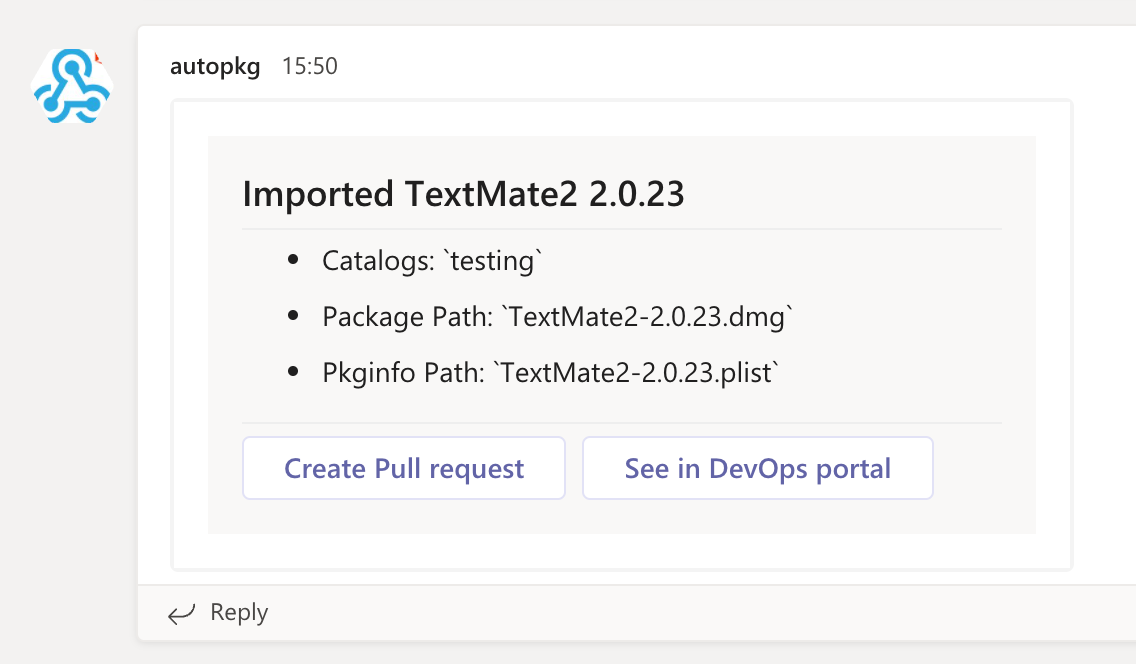If you want messages on builds in Teams, the script is prepared to use a Teams Webhook. The message sent looks like below, this makes it easy to keep an eye on when something is updated or added. There’s also buttons on the card to quickly create Pull Requests.