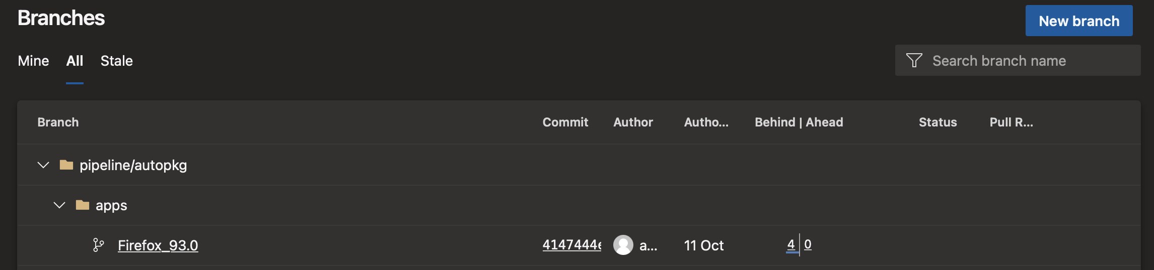 To add the app to Munki, you have to create a Pull Request to merge the changes into the main branch. This is a manual step because I want some level of control before the app is imported. Open your Munki repo and go to Branches. Under all, you can see that the AutoPkg pipeline created a branch for the app that was pushed.