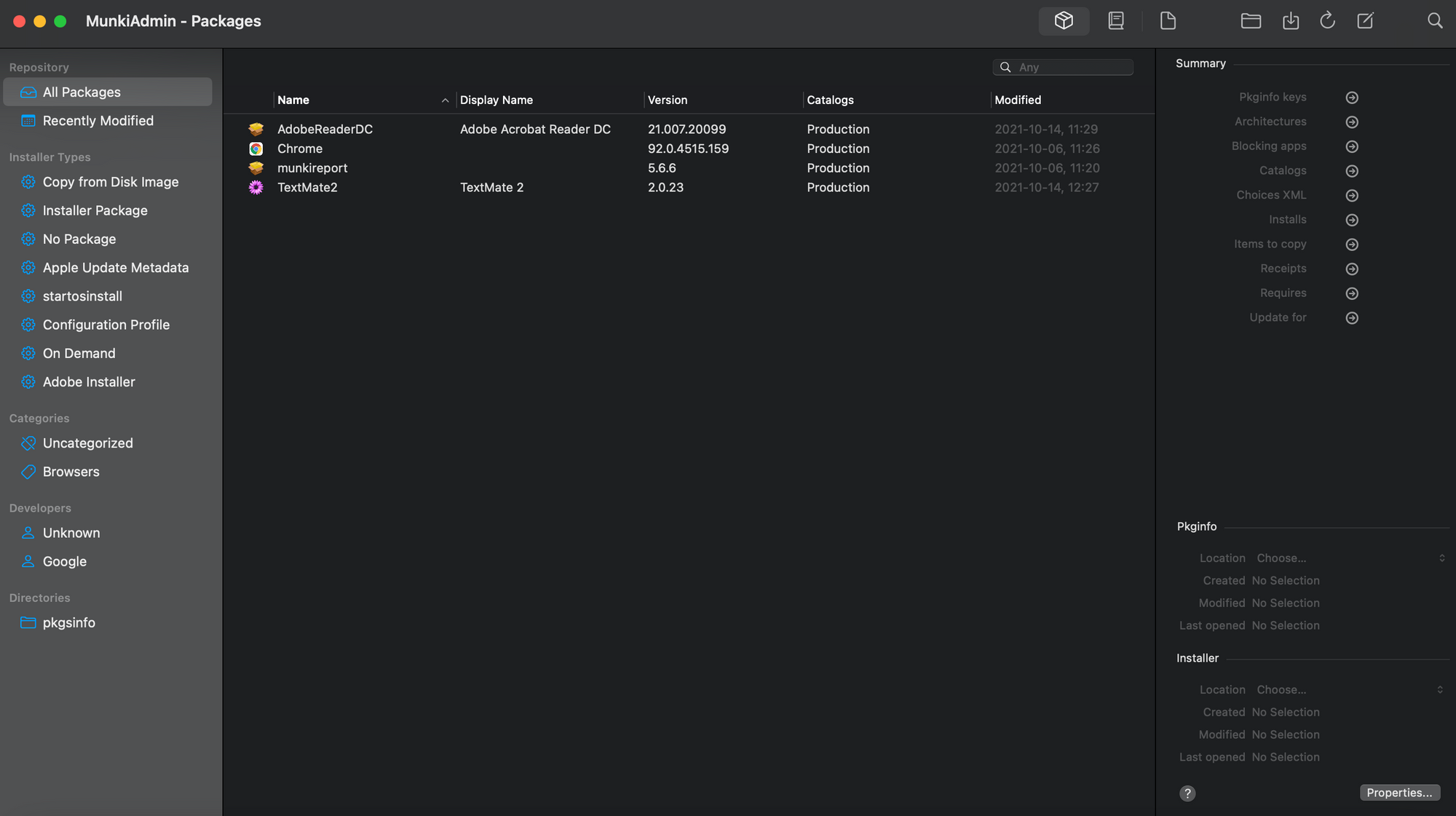 MUNKI_REPO_SUBDIR, this key specifies where in the /pkgs folder in the Munki repo this app should be placed, digging deeper we have more Munki parametes underpkginfoblocking_applications Google Chrome catalogs testing description Chrome is a fast, simple, and secure web browser, built for the modern web. developer Google display_name Google Chrome name %NAME% unattended_install Per default, most apps will be placed in a catalog called “testing”. If you want to change this you can just edit this file and save it. If you want to do it via Terminal you can use the following command, this is only an example but gives you an idea,