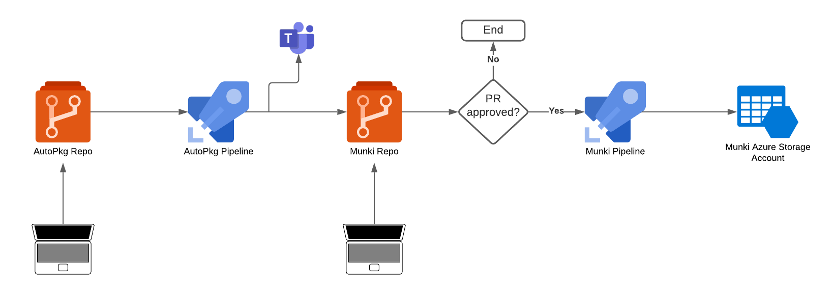 - If the PR is approved and merged, the Munki Pipeline kicks off and the new/updated app is synced to the Munki repo, if not, no action is taken
