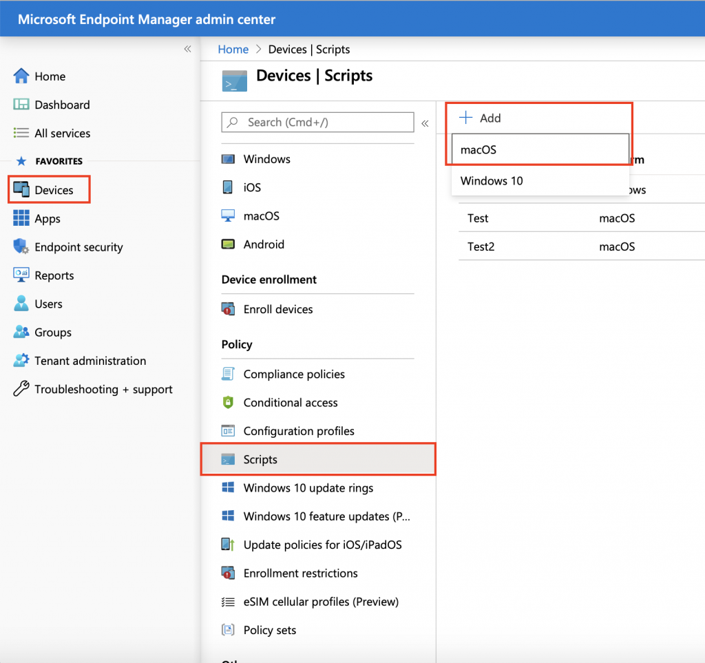 - Go to the MEM console and sign in. Then, Go to Devices -> Scripts -> Add and choose macOS.