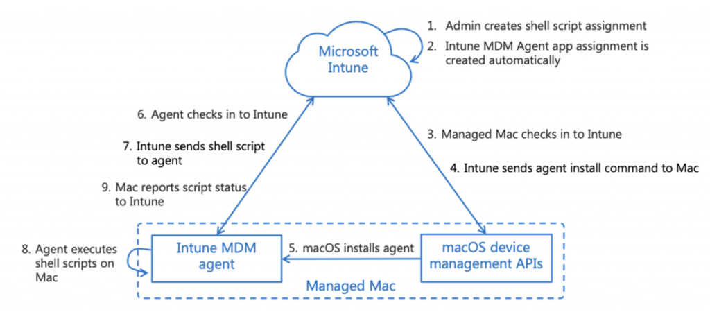 - The agent silently authenticates with Intune services before checking in to receive assigned shell scripts for the macOS device.