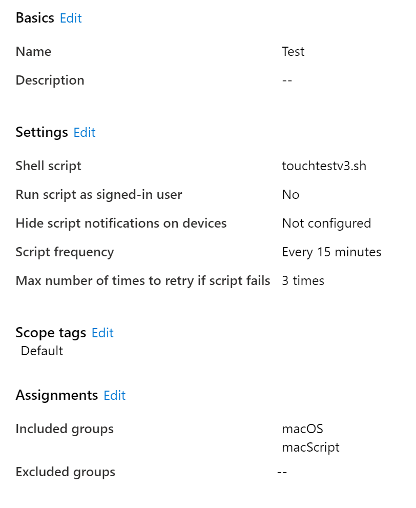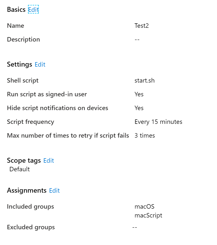 - User group assignment: Shell scripts assigned to user groups doesn’t apply to devices. User group assignment is currently not supported in preview. Use device group assignment to assign scripts.