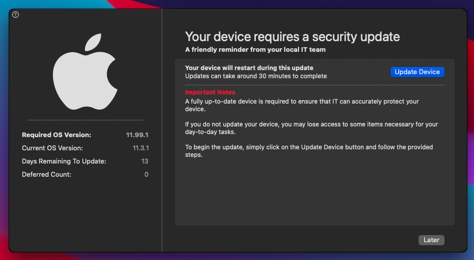 In Microsoft Endpoint Manager we do not have any good ways to control or enforce updates on macOS, all we can really do is defer updates or deploy a script. This is where I think Nudge comes into play, not just for MEM, but for all MDMs that can take advantage of the above methods as well.