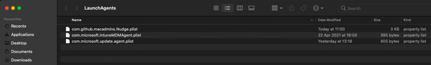 Once the script runs on your device, a file named com.github.macadmins.Nudge.plist will be created under /Library/LaunchAgents. Nudge will also be launched as soon as the agent is loaded.