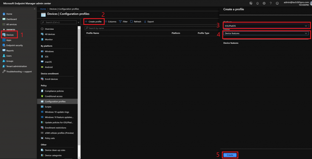 To configure, go to Devices -> Device Configurations, click Create Profile, choose iOS/iPadOS and Device Features for profile type and then click create.