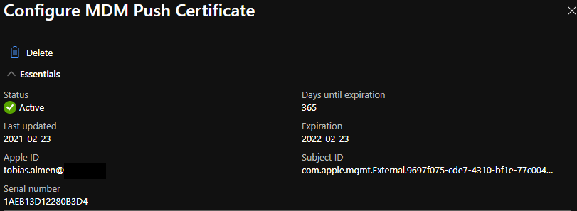 Besides APNs Mobile Device Management require an SSL certificate and a certificate to sign configuration profiles, though this is not something you have to provide when using Microsoft Endpoint Manager as Microsoft has already configured this.