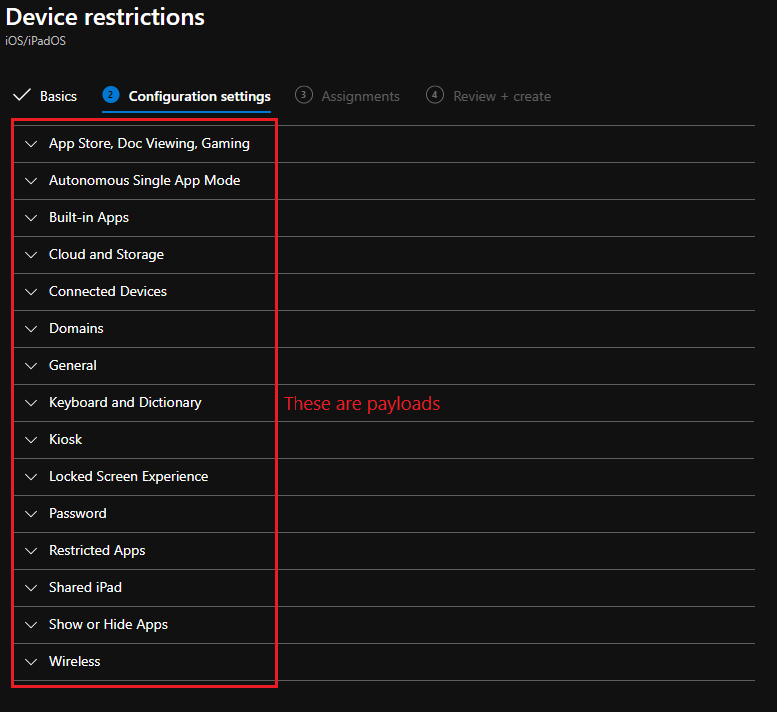 Payloads is what you configure in the configuration profile, this is the settings that will be applied on the device when the profile is installed. When you create a new configuration profile in Microsoft Endpoint Manager, you can choose the payloads you want to add, like setting a passcode or configuring email.