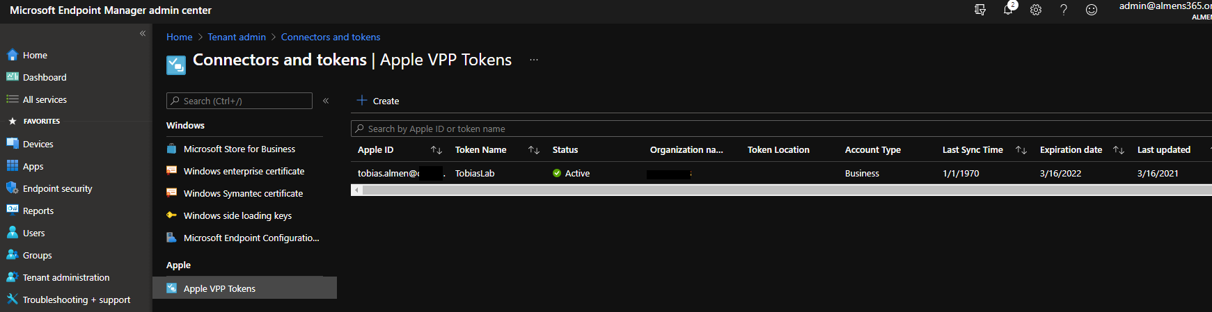 - Navigate to Tenant administration -> Connectors and tokens -> Apple VPP tokens and click on Create