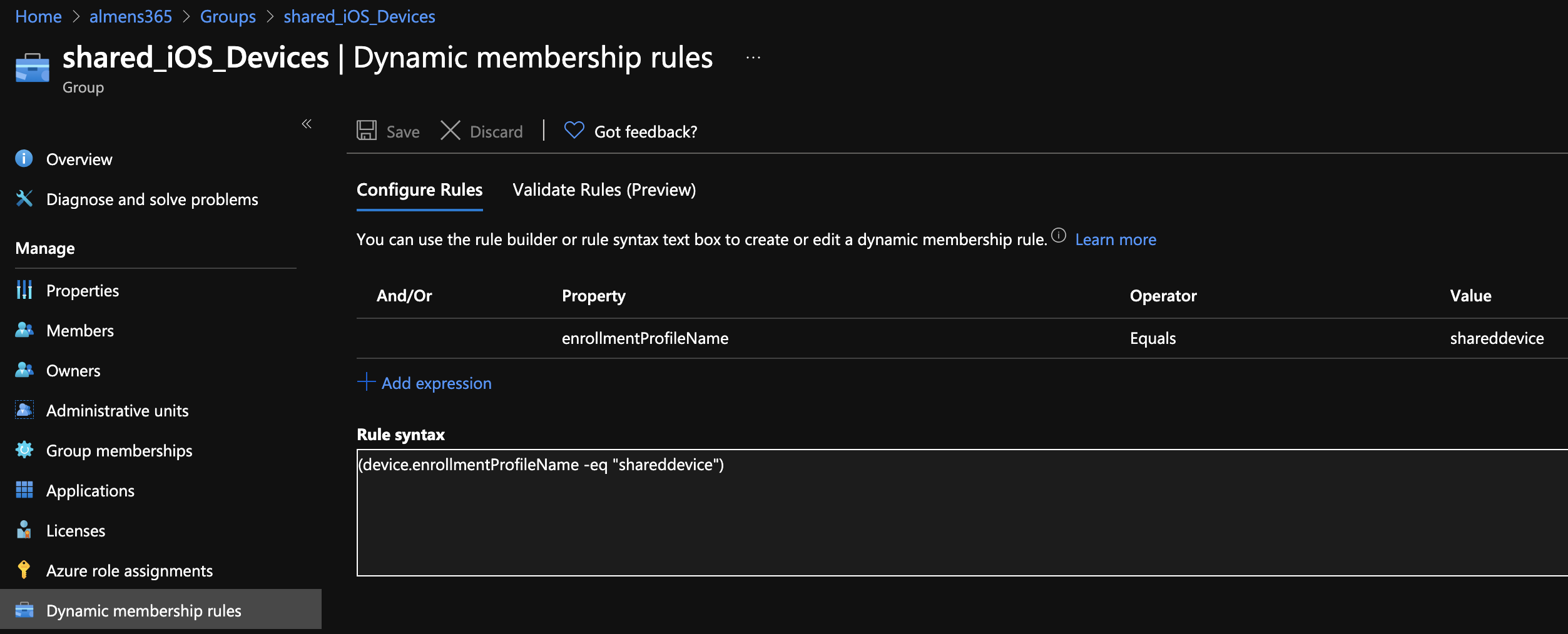 To make assignment of Microsoft Authenticator and the configurations easy, I’m going to setup a dynamic group that automatically adds devices assigned to the enrollment profile we created in the last step.