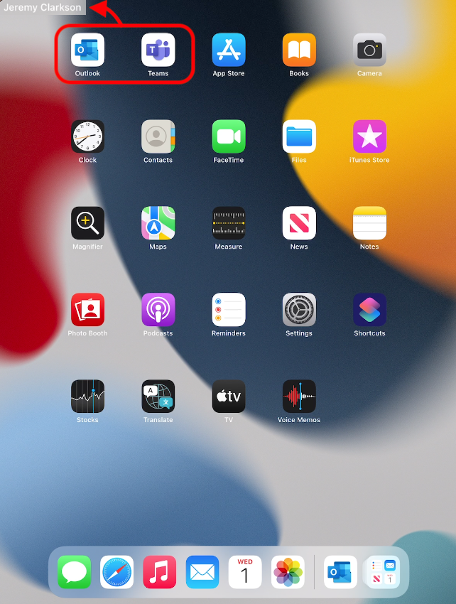 In my setup, I installed some applications assigned them to my dynamic device group and used one home screen layout configuration, in addition I created a restriction to hide Outlook and Teams for James May. Below you can see that Jeremy Clarkson can see and use Microsoft Outlook and Teams while these apps are not displayed for James May. To sign out of the iPad, the user only has to swipe down from the top and tap “sign out”