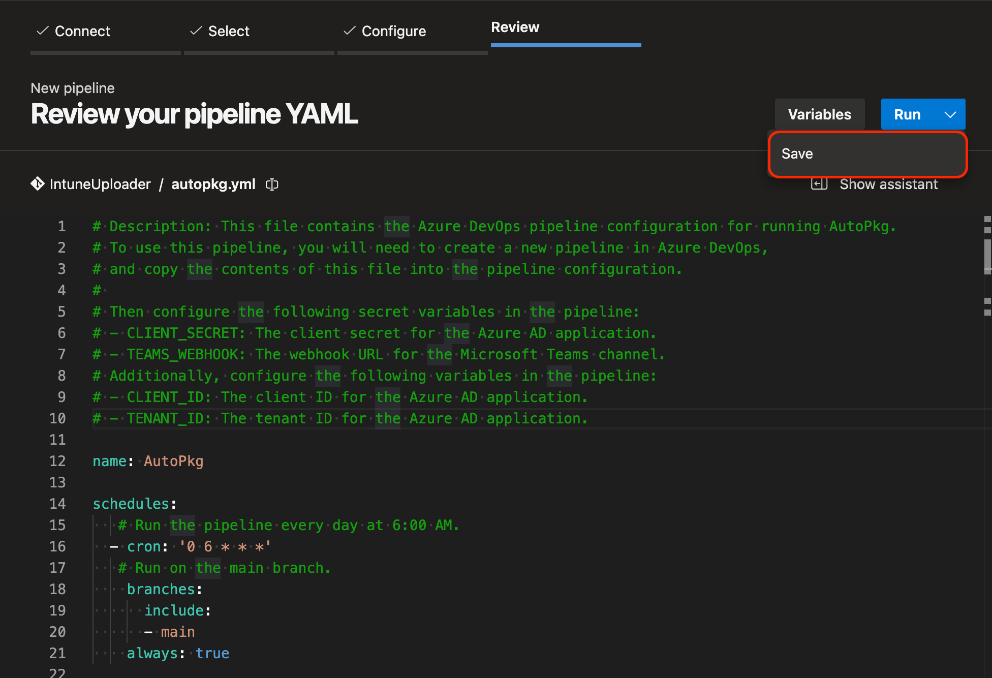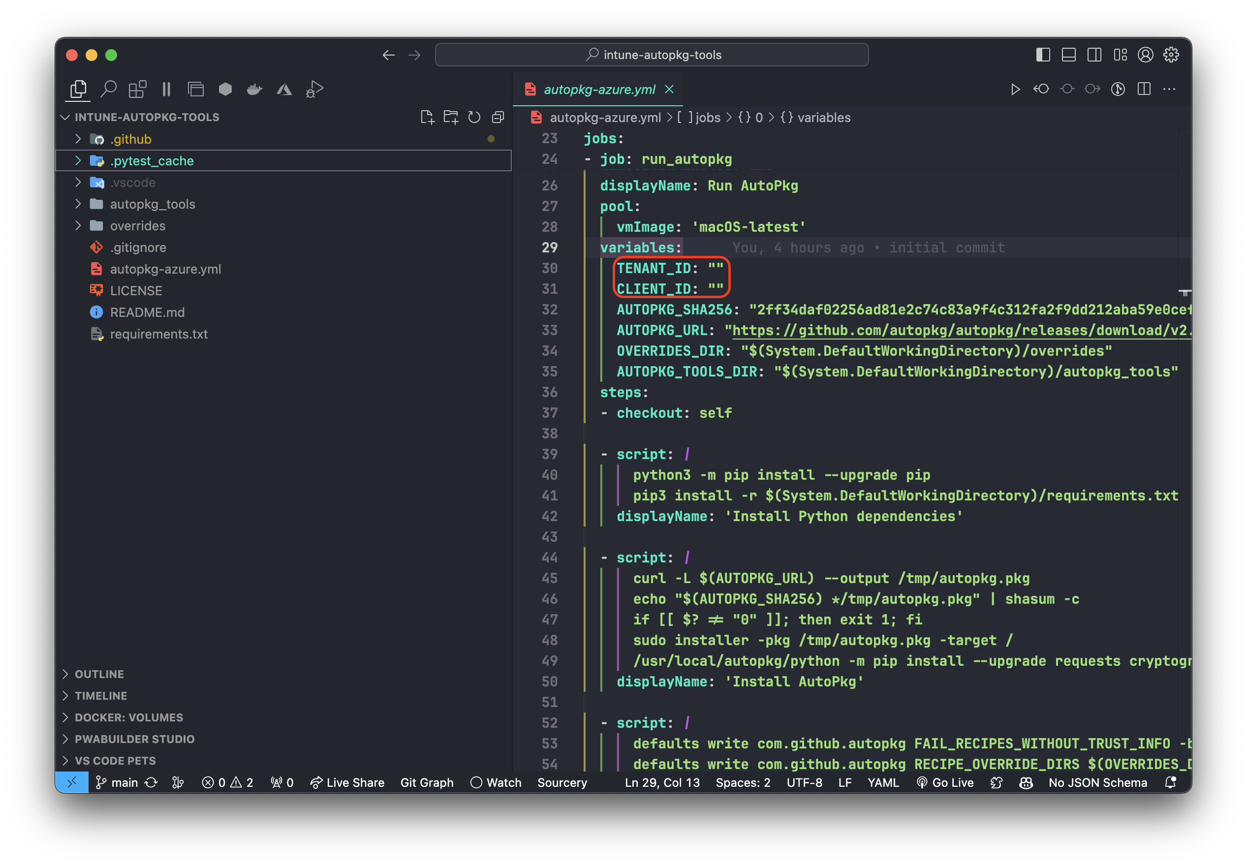 autopkg-azure.ymlfile in either a text editor and update variablesTENANT_IDandCLIENT_IDin theautopkg-azure.ymlfile to match your Entra ID settings.