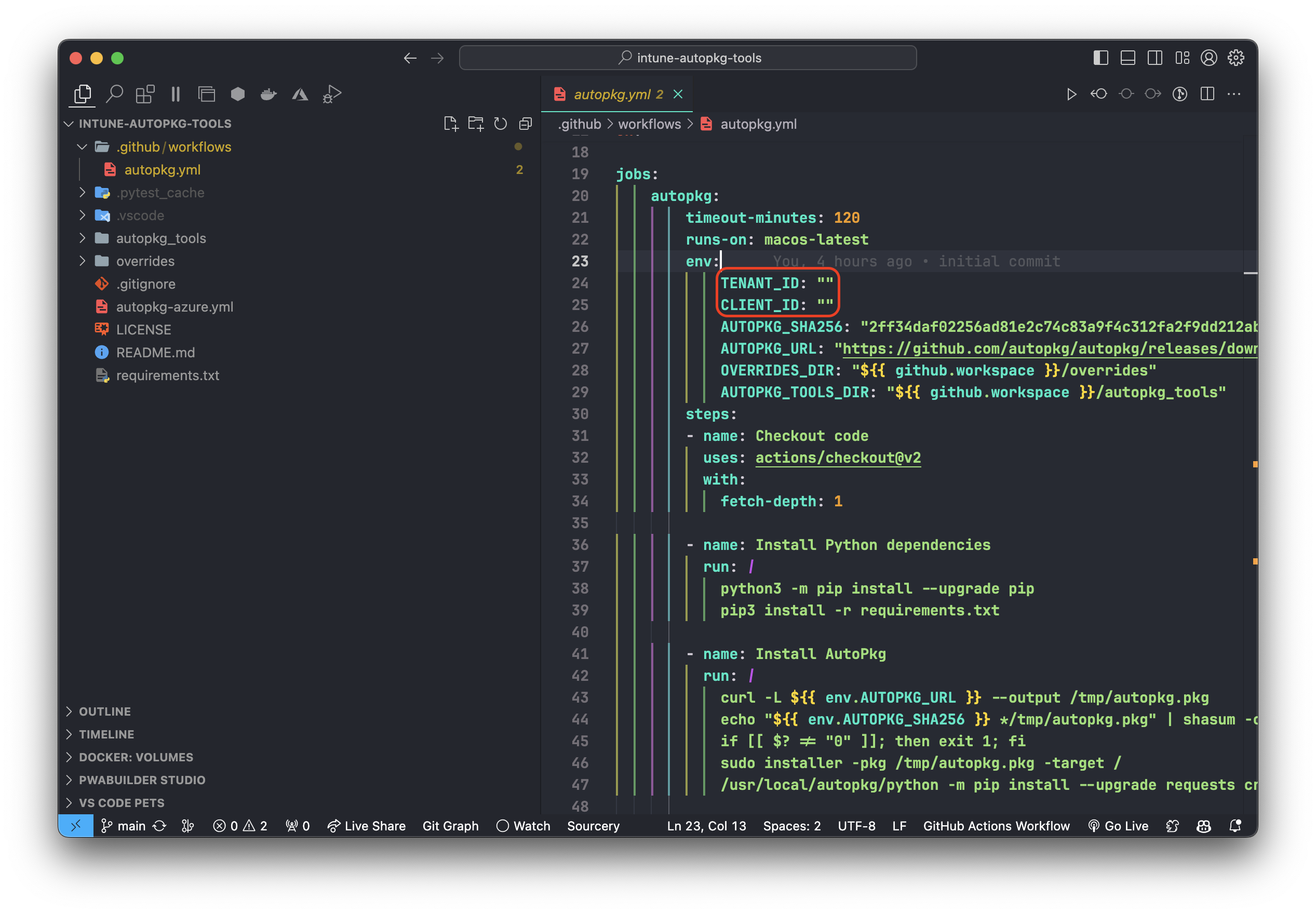 autopkg.ymlfile in a text editor and update variablesTENANT_IDandCLIENT_IDin the.github/workflows/autopkg.ymlfile to match your Entra ID settings.